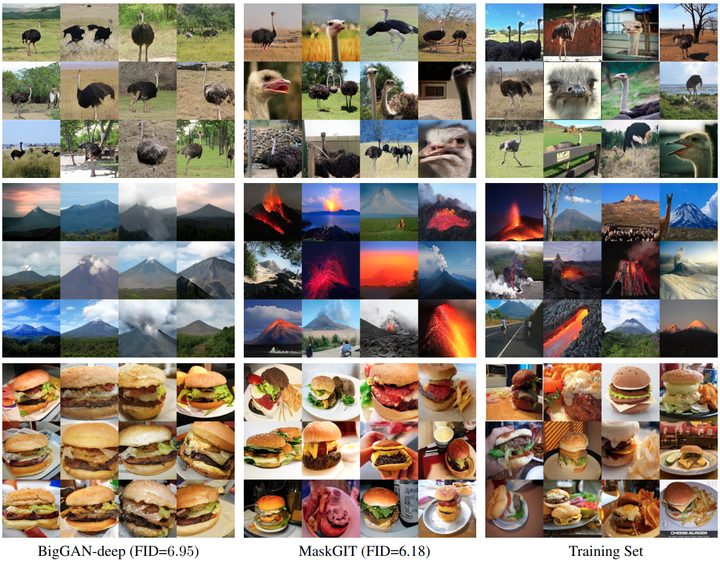 MaskGIT 的样本相对于 BigGAN 的样本更加多样化,光照、姿势、比例和上下文更加多样化,如图 6 所示。