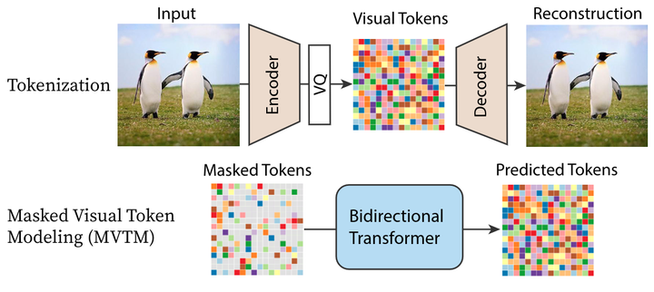 , 其中负对数似然计算为真实 one-hot token 和预测 token 之间的交叉熵。注意这步与自回归建模的关键区别: MVTM 中的attention 有两个方向, 允许图像关注图像中的所有 token, 以利用更丰富的上下文。