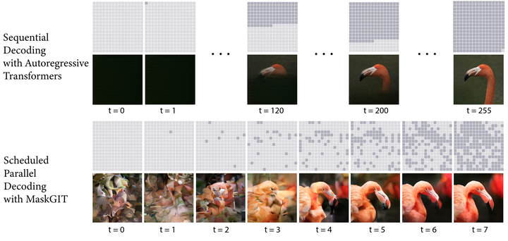 图2:上:自回归模型序列解码。下:MaskGIT 模型并行化解码,使用更少的步骤完成1 MaskGIT:非自回归的掩码图像生成 Transformer