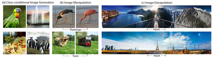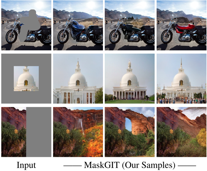 - MaskGIT 还适合自回归模型难以胜任的图像操作任务,比如图 1 就是一个新的应用场景:MaskGIT 根据给定的边界框重新生成其内部的内容,同时保持其他部分不变。这个任务对于自回归模型或者 GAN 来说都很难。