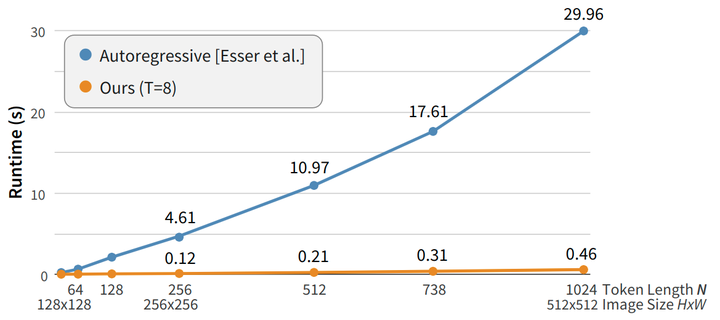 而且,MaskGIT 在两种分辨率上都改进了 BigGAN 的 FID,在 512×512 上实现了新的最先进的 FID 7.32。为了评估 MaskGIT 和自回归模型之间的速度差异,作者比较了 MaskGIT 和 VQGAN 的运行时间。如图 5 所示,MaskGIT 显着加速了 30-64× 的 VQGAN,随着图像分辨率(因此输入标记长度)的增长,加速更加明显。