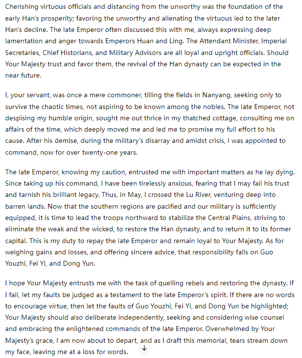 测试方法:由此我们从中国经典文言文中选择大家都很熟悉的《出师表》(诸葛亮),这部分主要考察模型对古文理解、翻译的准确性和文言韵味的保留。