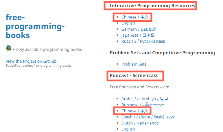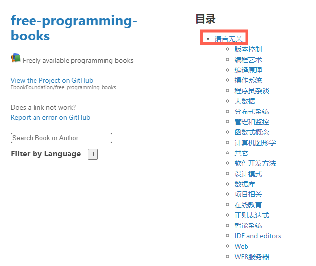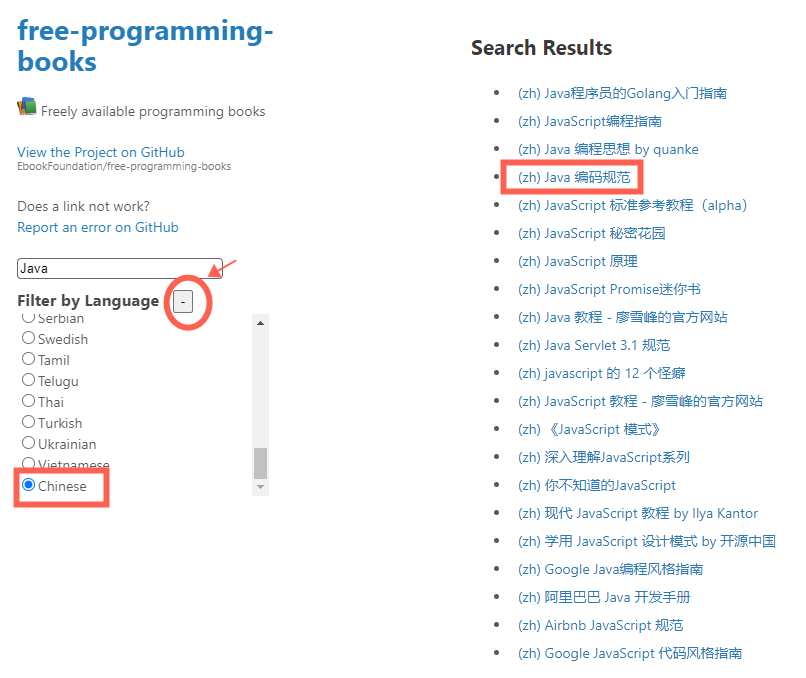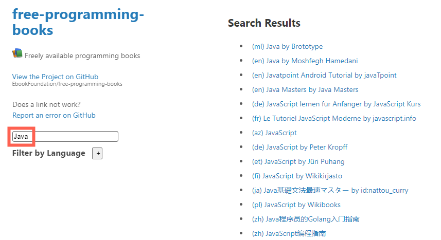 Free-Programming-books是一个怎样的项目?Free-Programming-books要怎么使用?项目的核心功能就是“搜索”:输入你想要的资源,会输出相关的搜索结果。如上图所示,搜Java,输出了Java相关的,多语言的学习资源。Filter 选 Chinese,就只有中文学习资源了。