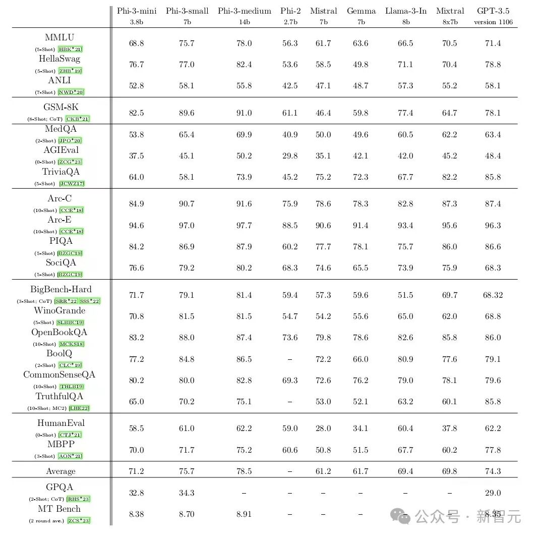 更有趣的是,拥有70亿个参数的微软Phi-3-small在许多基准测试中的表现都明显优于GPT-3.5。