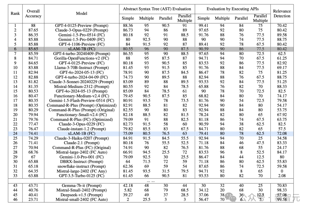 各种AI模型在不同评估指标下的性能对比图。GPT-4-0125-Preview在总体准确性方面遥遥领先,而xLAM-7B等较小的模型在特定任务中表现出了竞争力,这对大模型总是表现更好的说法提出了挑战
