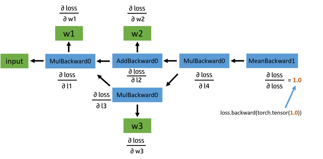 loss.backward() print(w1.grad, w2.grad, w3.grad)# tensor(28.) tensor(8.) tensor(10.) print(l1.grad, l2.grad, l3.grad, l4.grad, loss.grad)# None None None None None