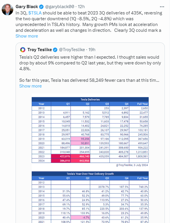 Gary Black:第三季度,TSLA 的交付量应能超过 2023 年第三季度的 43.5 万辆,扭转 TSLA 历史上前所未有的两个季度的下滑趋势(第一季度-8.5%,第二季度-4.8%)。许多增长型项目管理公司都会关注加速和减速以及方向的变化。 显然,第三季度可能标志着方向的改变--特别是如果随后宣布推出 2.5 万至 3 万美元的 TSLA 紧凑型车,将 TAM 推广到大众。