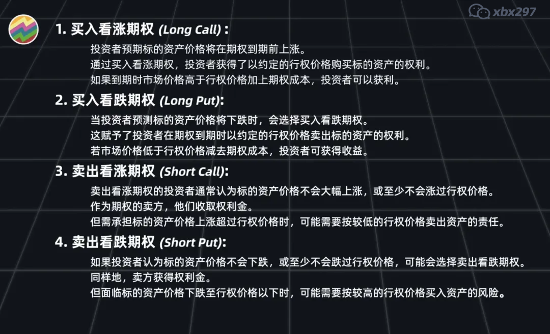 买卖方的看涨看跌因此构成了期权交易的四个基本方向: