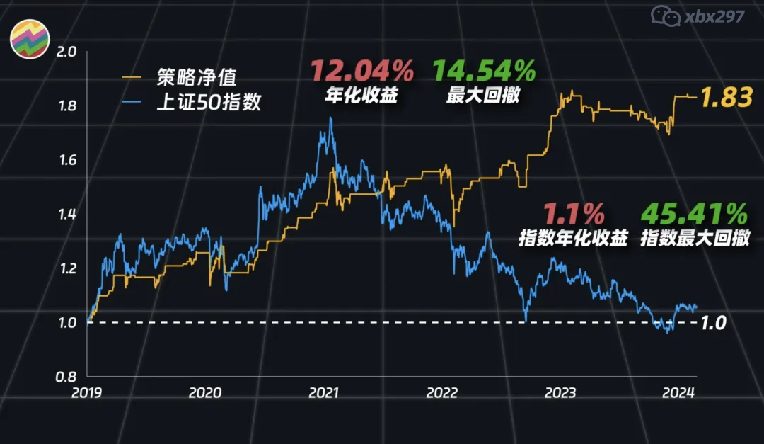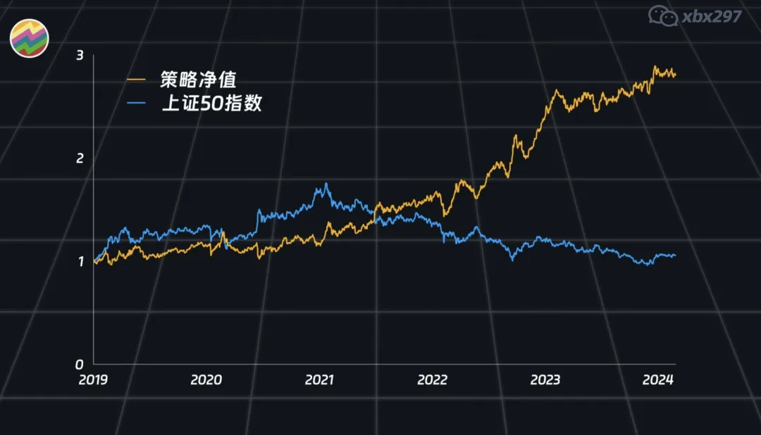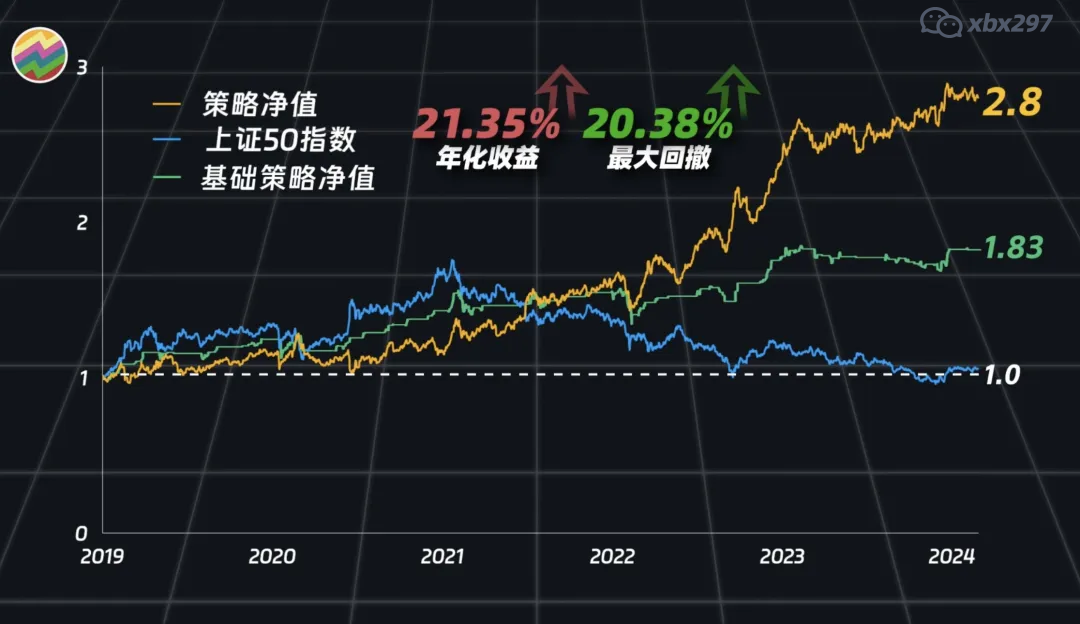 代表策略的橙色曲线从1元涨到了2.8,同样大幅跑赢上证50指数。