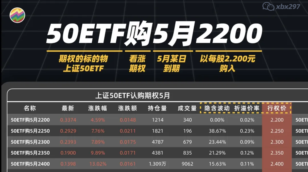 如50ETF购5月2200期权即是:5月某日到期的以每手2200元购入上证50ETF的看涨期权。