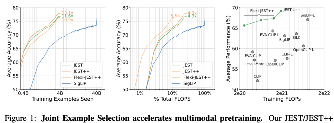 左图中,相比原有的SigLIP基线模型,JEST++可以在训练数据量减少13.1×的情况下达到相同准确率。即使考虑到额外引入的打分成本,也有近10×的FLOP效率提升(中图)。