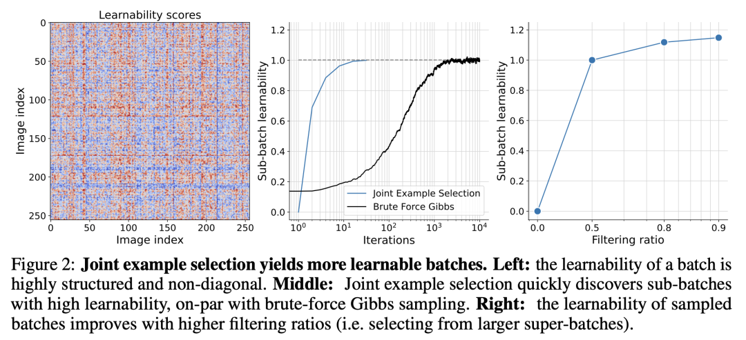 经过少量迭代(对应于用N=16个块填充batch),作者发现子batch的可学习性快速增加,达到了需要数千次迭代的暴力吉布斯采样(Gibbs sampling )所提取batch的可学习性(图2,中)。