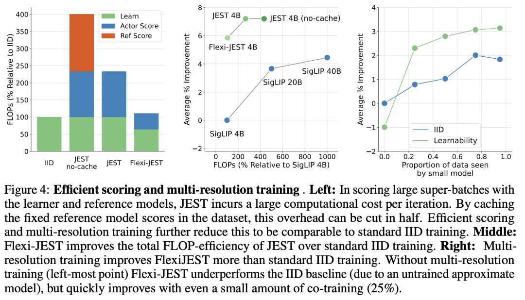 尽管JEST在训练迭代次数方面(以下简称「训练效率」)显著提高了效率,但额外的评分浮点运算降低了其相对于IID基准的计算效率(图1,左vs右)。