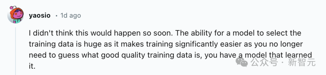网友激动表示,「我没想到这么快就会发生。模型能够自主选择训练数据的能力是巨大的,因为它使训练变得显著更容易,你不再需要猜测什么是高质量的训练数据,你有一个能够『理解』什么样的数据对自身学习最有价值的模型」。