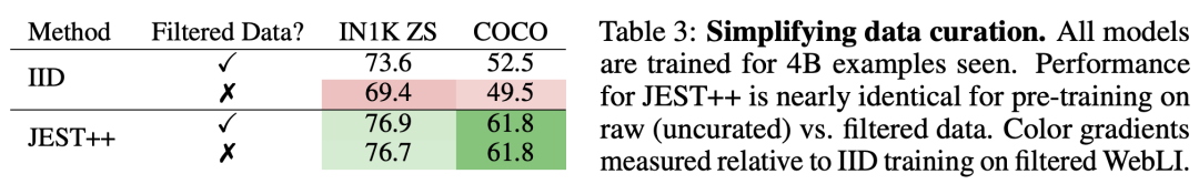 如表3所示,这种离线数据管理流程对IID(独立同分布)训练方法的性能至关重要,但JEST++则表现出了对预过滤流程的鲁棒性。即使没有过滤,JEST++的性能也没有出现明显下滑,降低了模型对基础数据集的要求。