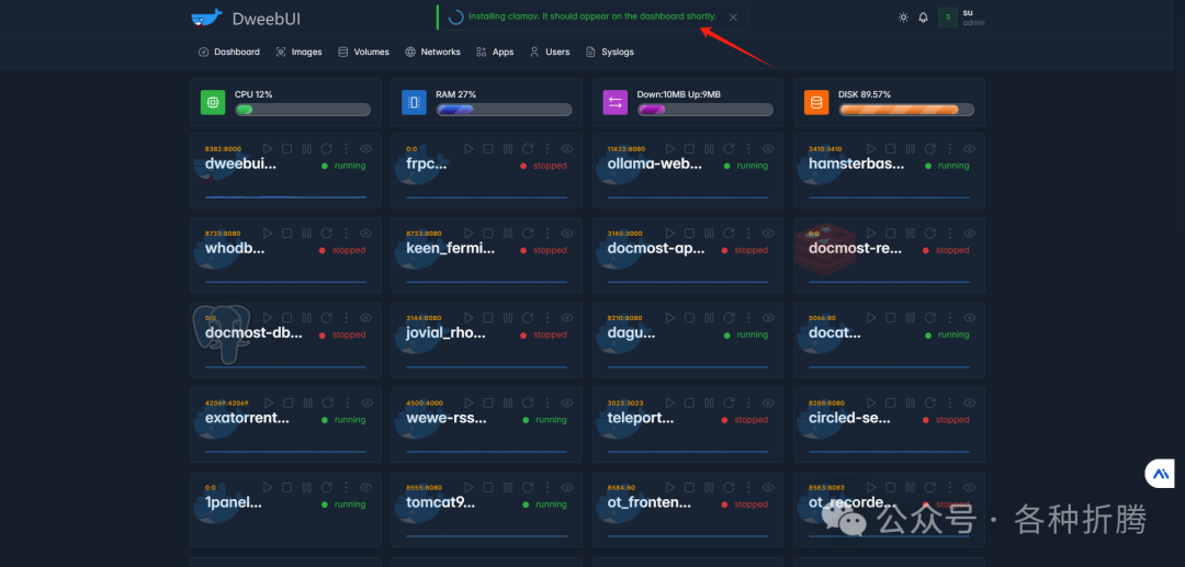 如果你的机器能正常访问 docker hub,安装完成后的容器会显示在 Dashboard 界面上