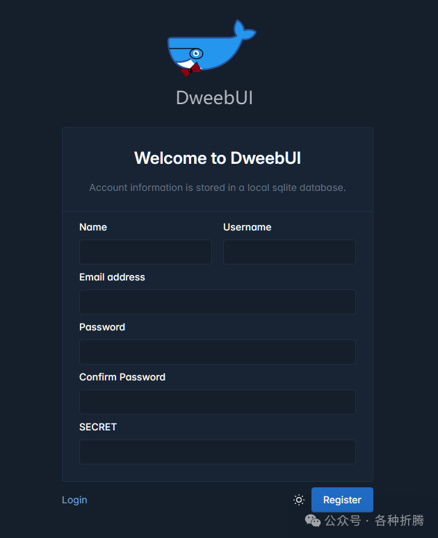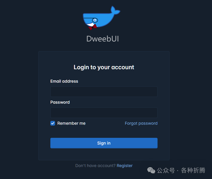 # 新建文件夹 dweebui 和 子目录 mkdir -p /volume1/docker/dweebui/config# 进入 dweebui 目录 cd /volume1/docker/dweebui# 将 docker-compose.yml 放入当前目录 # 一键启动 docker-compose up -d运行 在浏览器中输入 http://群晖IP:8382 就能看到登录界面