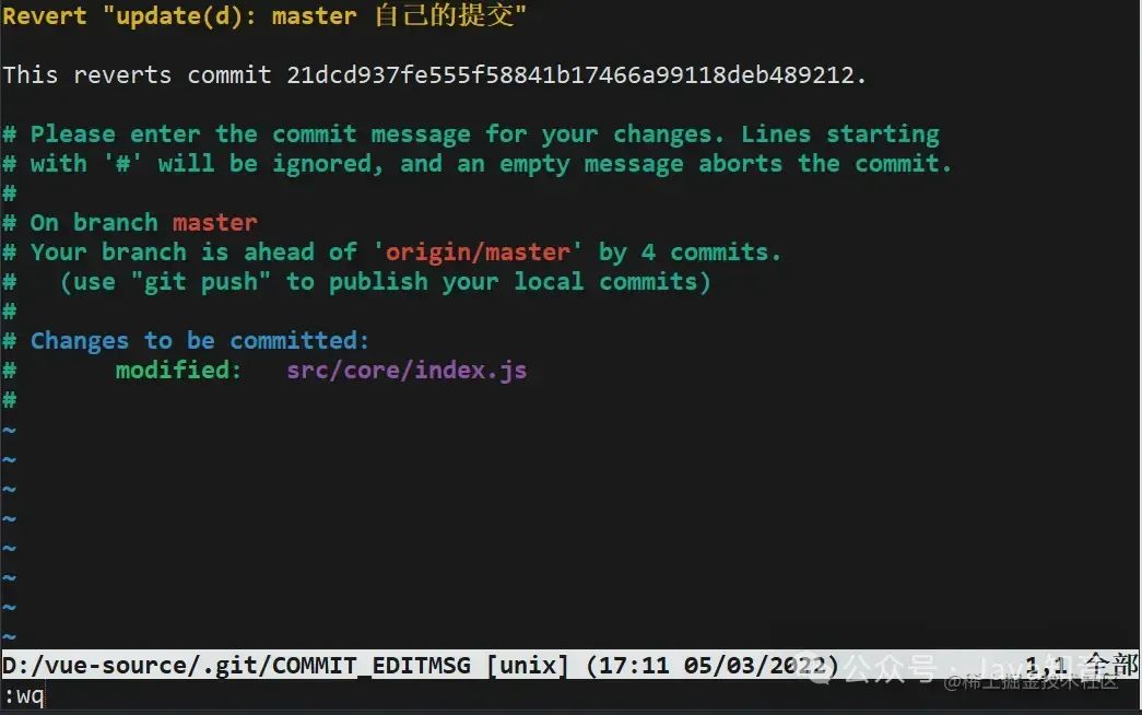 因为 revert 会生成一条新的提交记录,这时会让你编辑提交信息,编辑完后 :wq 保存退出就好了。
