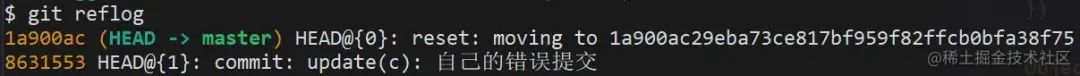 这时用 git reflog 查看历史记录,把错误提交的那次 commitHash 记下。