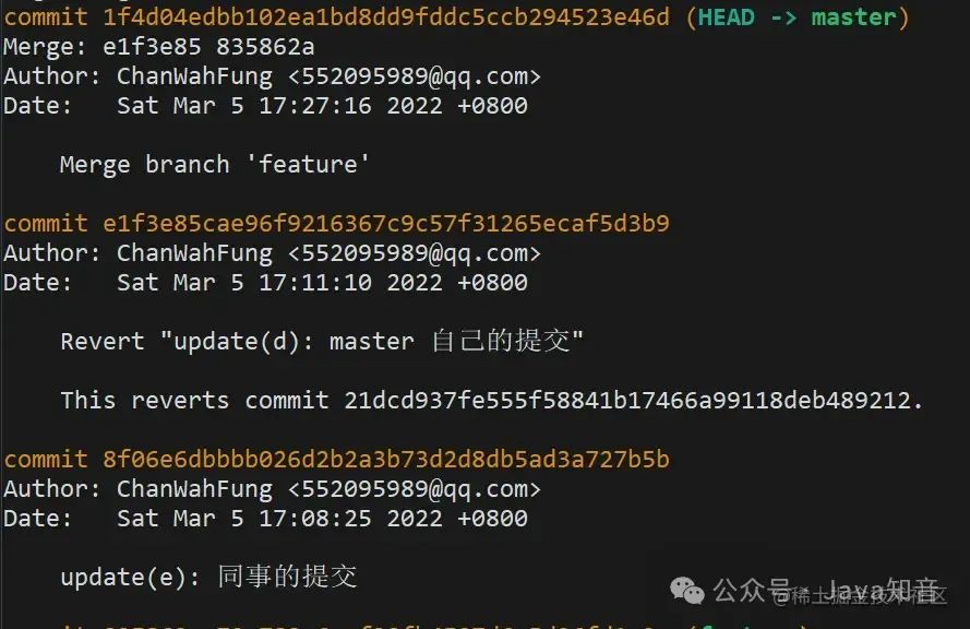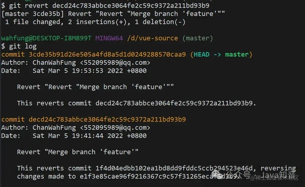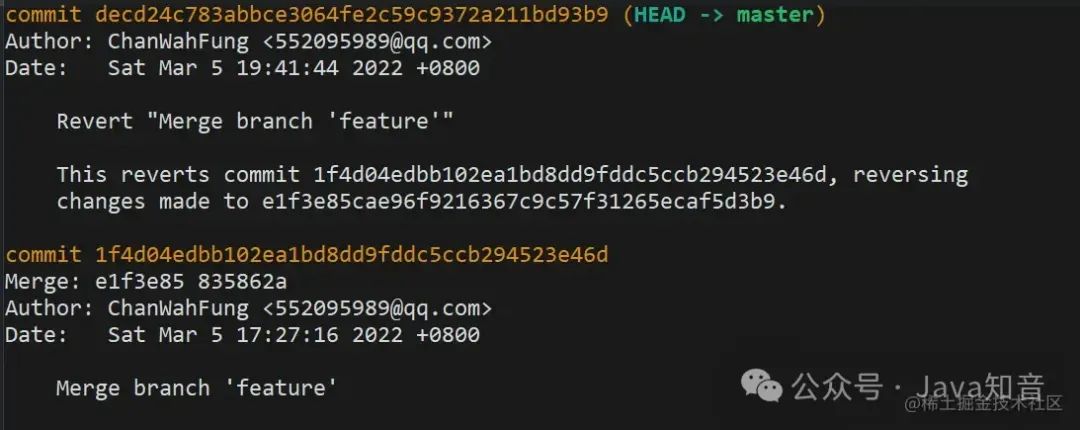 再来看下最新的 log,生成了一条 revert 记录,虽然自己之前的提交记录还是会保留着,但你修改的代码内容已经被撤回了。