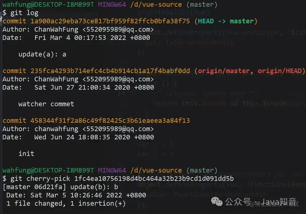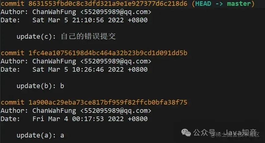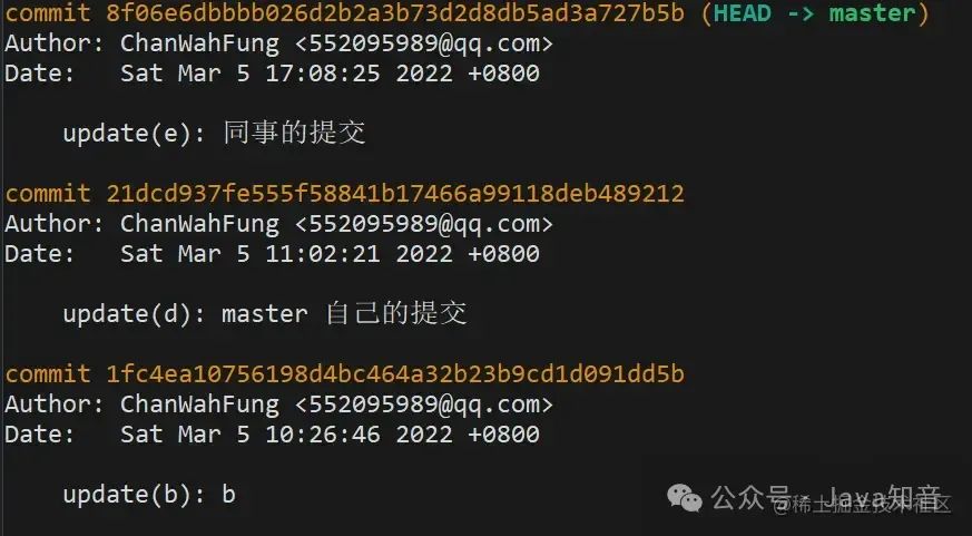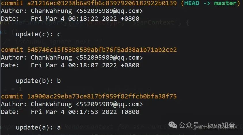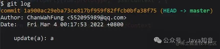 完成后看下最新的 log,b 已经应用到 master,作为最新的 commit 了。可以看到 commitHash 和之前的不一样,但是提交时间还是保留之前的。