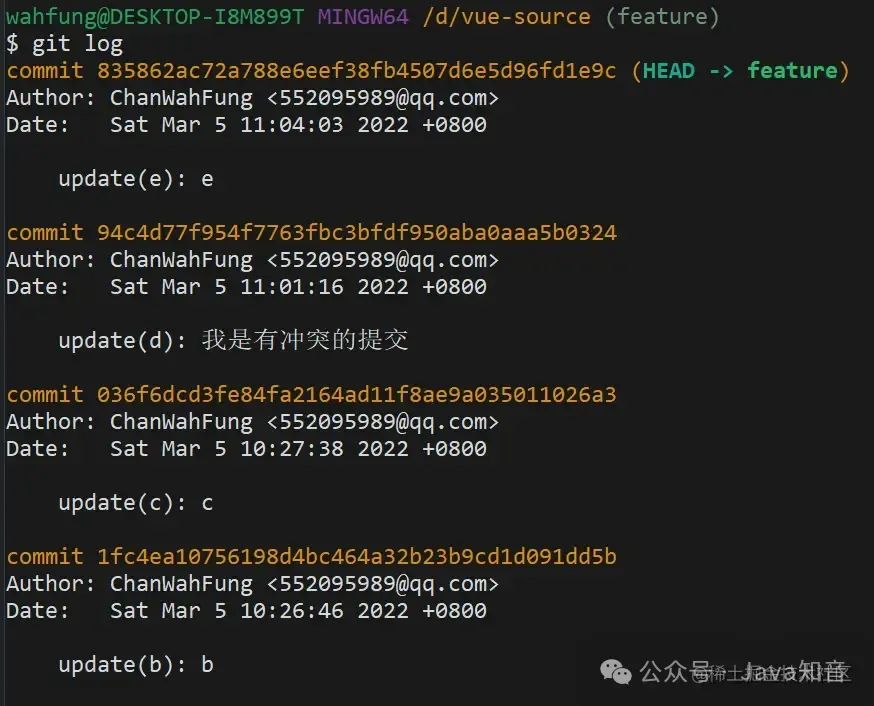 现在有一条feature分支,commit 记录如下: