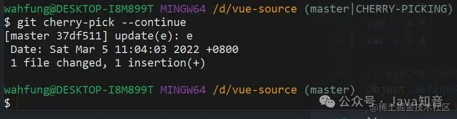 然后使用 cherry-pick --continue 让 cherry-pick 继续进行下去。最后 e 也被复制进来,整个流程就完成了。