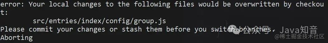 应用场景:某一天你正在 feature 分支开发新需求,突然产品经理跑过来说线上有bug,必须马上修复。而此时你的功能开发到一半,于是你急忙想切到 master 分支,然后你就会看到以下报错: