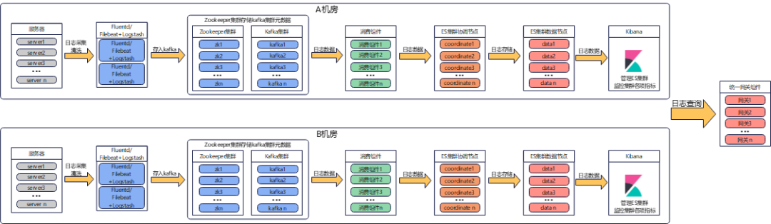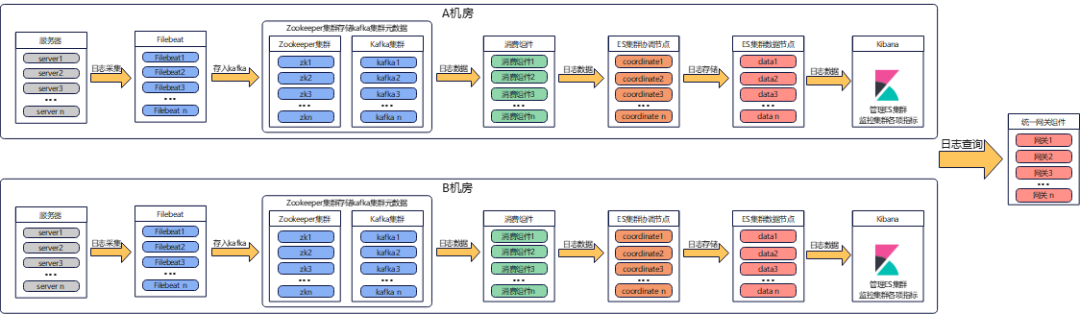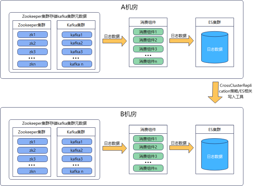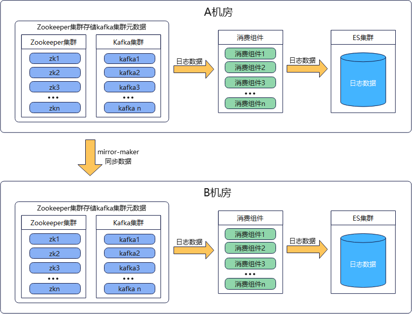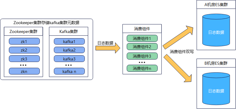 由图9可知,可以通过mirror-maker工具同步两侧机房中kafka的日志数据,再由各自机房的消费组件将日志消费写入Elasticsearch集群。
