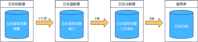 该规模的日志中心,往往可对数据做较长时间的保留,而且在一个月内对于日志的读写都很频繁,故而热数据周期一般设置为0-1个月,温数据周期设置为1年左右,将 1-3年的数据设置为冷数据,超过三年后的数据,将做归档处理,存入磁带库中进行保存。