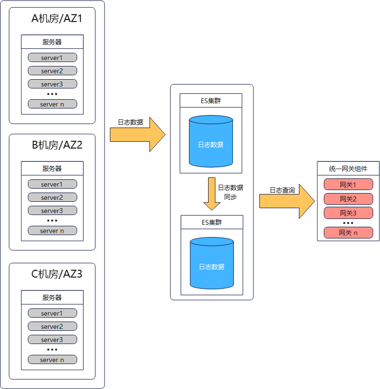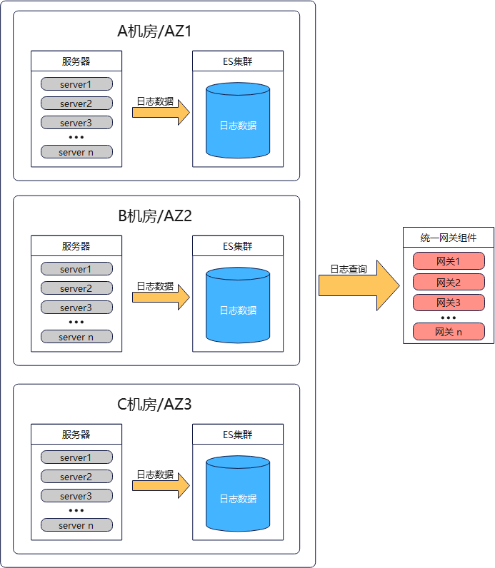 如图所示,为笔者曾遇到过的日志中心的场景,各机房/AZ接收各自的日志数据,再通过统一网关组件进行日志查询,由于各自接收自身机房的日志数据,故而该场景下,相对来说Elasticsearch集群所需资源相对较小。
