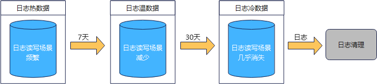 如图8所示,这种平台下的日志一般会对Elasticsearch集群设置基础的生命周期策略,大多数场景下,一般会维持1-7天的热数据,此时数据读写频繁,7-30天时,Elasticsearch早期索引写入数据的场景几乎消失,读数据场景较为频繁,30天后,读数据场景几乎消失(很少场景下会查询30天后的日志数据),进而变为冷数据,最终删除。