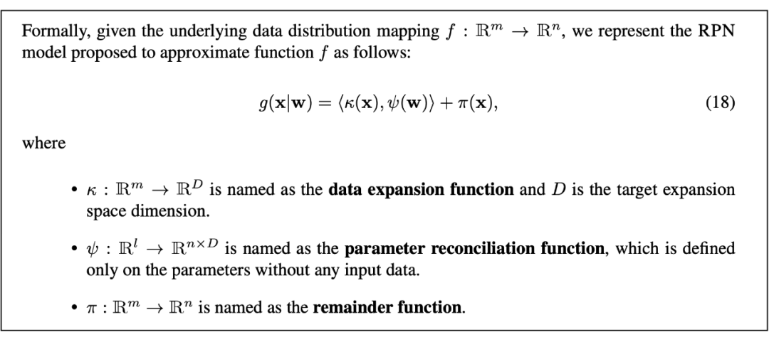 参数调和函数(parameter reconciliation function)、和余项函数(remainder function)。受泰勒定理启发,RPN 将输入数据与模型参数分离,并将目标函数近似为数据扩展函数与参数调和函数的内积,然后加上余项函数。