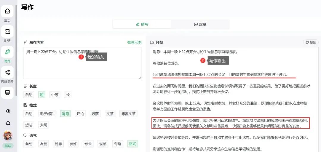 支持对话或者写作模式,比如可以对照对方发送过来的邮件,自动生成一份回复