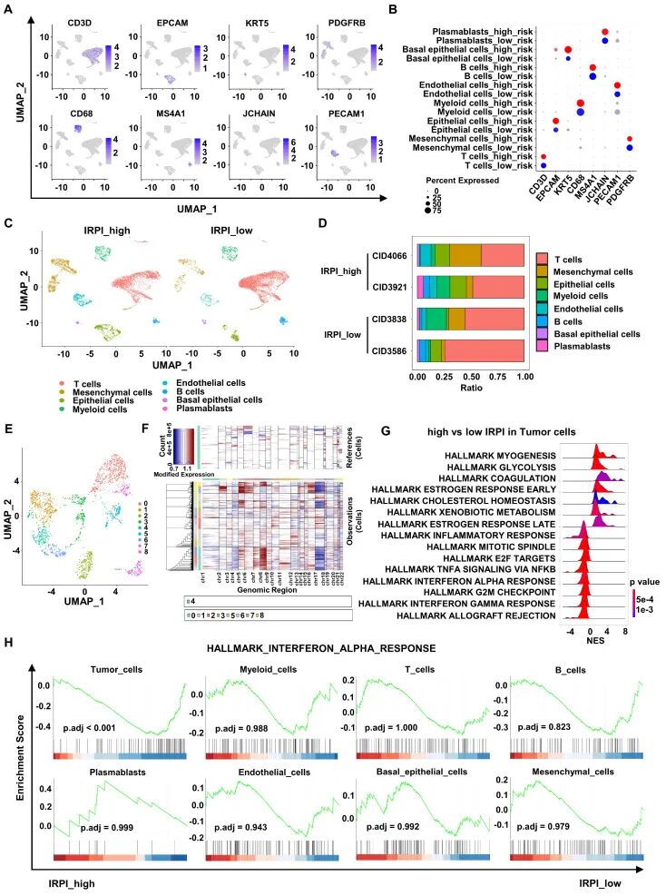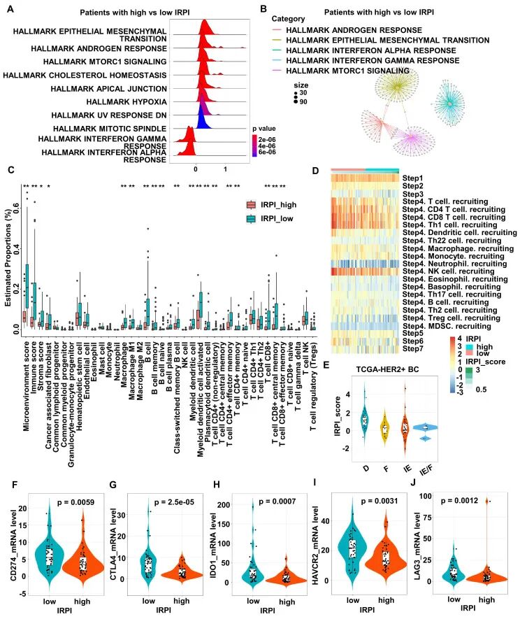 首先,为了发现与 HER2+ BC 预后最相关的基因模块,使用一剂赫赛汀治疗后 HER2+ BC 患者的表达谱进行 WGCNAGSE76360队列(图1A)。软阈值功率值设置为6,用于后续分析(图S1A)。进行动态模块鉴定,将5个共表达模块聚类,蓝色模块与临床反应呈最强正相关(Cor = 0.45,p < 1e-200)(图1B-D,图S1B)。通过GO富集检验蓝色模块中总基因的潜在功能。结果包括对免疫系统过程的调节,包括白细胞介导的免疫、白细胞间粘附和免疫细胞活化的调节。此外,还使用来自GSE76360队列。进行动态模块鉴定,将4个共表达模块聚类(图S1D),蓝色模块与临床反应呈最强的正相关(图S1E)。通过GO富集检验蓝色模块中总基因的潜在功能。结果包括几种免疫相关通路,包括Fc受体信号通路(p值=0.0057)、髓系白细胞迁移(p值=0.0139)和巨噬细胞衍生的泡沫细胞分化(p值=0.0141)。上述结果表明,免疫相关信号转导与HER2+ BC的预后呈正相关(图1E,图S1D-E)。然后作者研究了抗HER2治疗对HER2+ BC免疫微环境的影响。确定了一剂赫赛汀治疗 (Biopsy-2) 之前和之后的 DEG 以在GSE76360根据治疗反应进行队列。结果显示,赫赛汀治疗后pCR患者明显激活了许多免疫相关的生物过程,如白细胞脱颗粒、髓样细胞活化和肥大细胞介导的免疫(图1F),而多种免疫相关通路,如IFN信号转导,包括IFN-α反应通路和IFN-γ反应通路,在无反应的患者中下调(图1G,图S1C)。作者还研究了赫赛汀治疗后无反应患者肿瘤微环境景观的变化。xCell算法估计的肿瘤微环境成分表明,无反应患者靶向治疗后肿瘤免疫细胞浸润率和评分呈下降趋势,但无统计学意义(图1H)。总而言之,免疫相关信号传导,尤其是I型IFN信号传导,在HER2靶向治疗后预后不良的HER2+ BC患者中会下调。构建 HER2+ BC 的免疫相关预后指数 (IRPI)为了充分考虑肿瘤的免疫浸润并更好地选择可能从赫赛汀治疗中受益的 HER2+ BC 患者,构建了 IRPI 以进一步分层。指标构建流程如图所示图2A.首先,通过低剂量赫赛汀处理(5μg/ ml)建立赫赛汀耐药HER2 + BC细胞系超过6个月(图S2A;图 S3A).