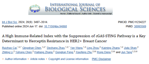 今天给同学们分享一篇生信文章“A High Immune-Related Index with the Suppression of cGAS-STING Pathway is a Key Determinant to Herceptin Resistance in HER2+ Breast Cancer”,这篇文章发表在Int J Biol Sci期刊上,影响因子为8.2。