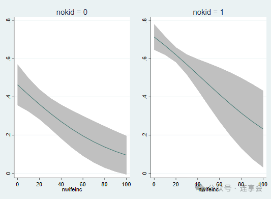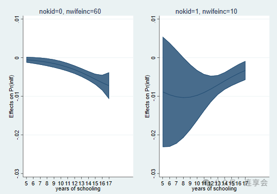 . quietly logit inlf c.nwifeinc c.educ c.nwifeinc#c.educ i.nokid, robust nolog . quietly margins, dydx(nwifeinc) at(educ=(5(1)17) nokid=(0) nwifeinc=(60)) . quietly marginsplot, recast(line) recastci(rarea) name(kidhigh) /// > scheme(white_tableau) title("nokid=0, nwifeinc=60") . quietly margins, dydx(nwifeinc) at(educ=(5(1)17) nokid=(1) nwifeinc=(10)) . quietly marginsplot, recast(line) recastci(rarea) name(nokidlow) /// > scheme(white_tableau) title("nokid=1, nwifeinc=10") . graph combine kidhigh nokidlow, ycommon xcommon从上图可以看出,丈夫的工资对妇女参加工作概率的影响取决于妇女的教育水平的。对于没有孩子且丈夫的工资又很低的妇女,其受教育年限的提高可以增加参加工作的概率,这一点符合我们的常识。然而对于那些有孩子且丈夫的工资又很高的妇女,我们不禁吃惊地发现随着妇女教育水平的提高,其参加工作的积极性反而会下降。
