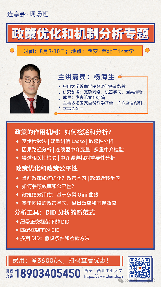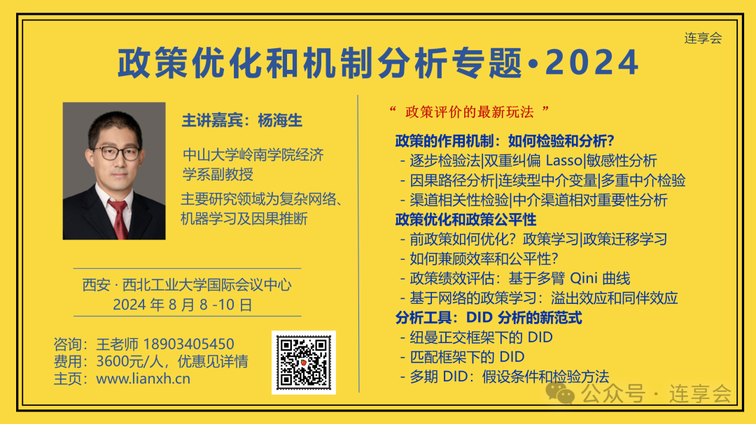 🍓 课程推荐:2024 政策优化和机制分析专题 主讲老师:杨海生 (中山大学) 课程时间:2024 年 8 月 8-10 日 (三天) 授课地点:西安 · 西北工业大学 (线下授课)
