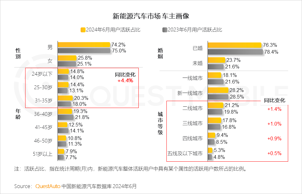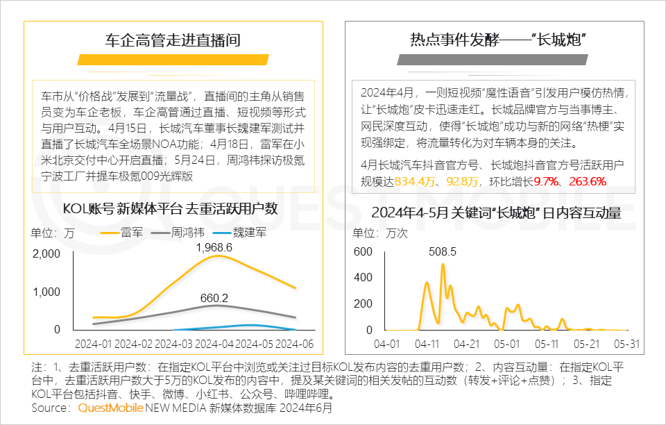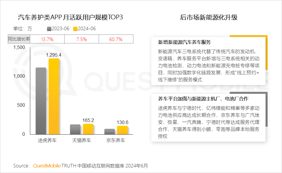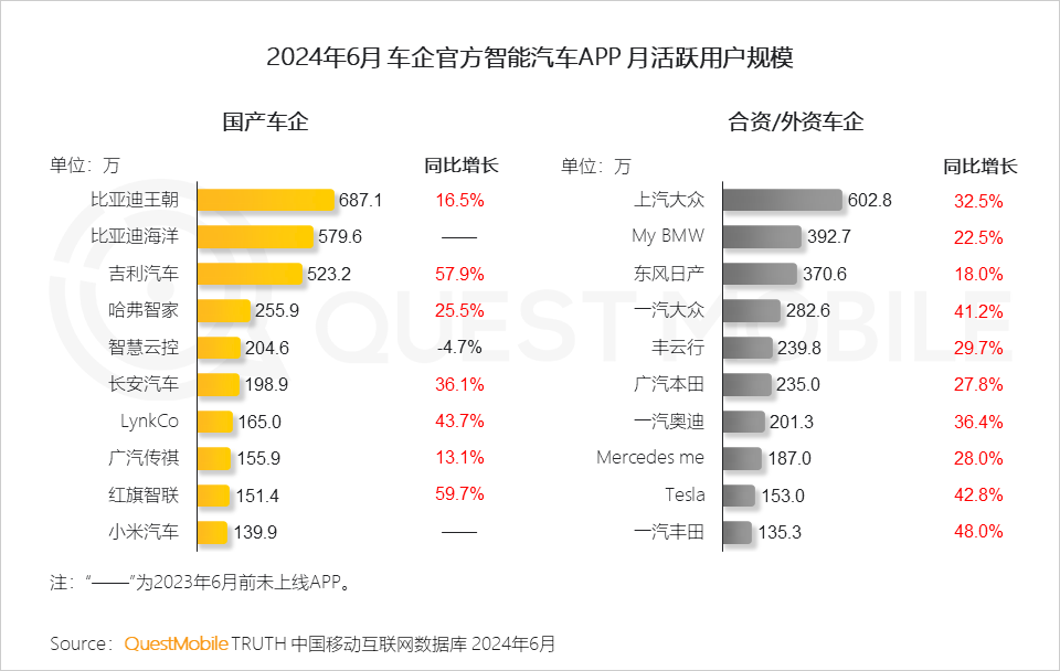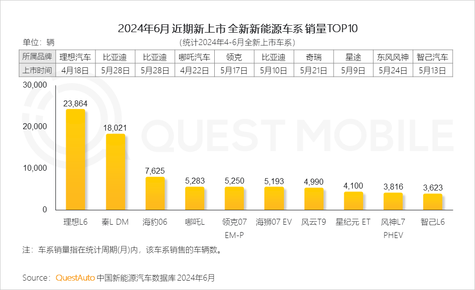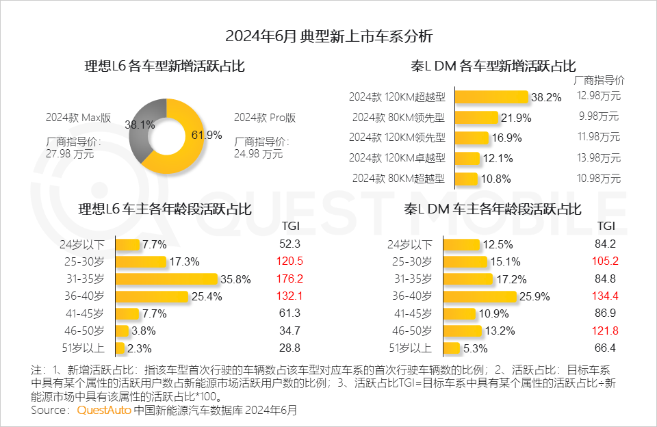 6.3 更多汽车品牌选择短视频、直播等新媒体形式进行营销,内容传播更易创造热点事件,扩大品牌影响力6.4 智能网联背景下,车企积极构建以APP为核心的线上渠道,合资车企具有存量优势,国产新兴自主品牌加快追赶脚步6.5 新能源购车人群中,35岁以下年轻群体占比显著增长,二三线城市新能源汽车渗透率不断提升,逐步撬动四线及以下市场6.6 二季度多款新车集中上市,理想L6成为大热门,6月销量突破两万辆,比亚迪近期推出的三款新车全部上榜,其中秦L DM销量达1.8万辆6.7 理想L6作为理想L系列旗下第四款车型,价格更易被年轻人接受,与其他车系形成互补,完善产品布局;比亚迪秦L推出五款车型,吸引不同年龄段的用户6.8 问界新M7 Ultra从驾驶辅助系统、主动安全技术、底盘等多方面进行大幅升级,提供更加安全、舒适和智能的驾驶体验,新增配色满足消费者个性化追求2024年5月31日,问界新M7 Ultra正式上市,共推出 4 款车型,其中五座四驱智驾版受到更多用户的青睐,6月新增活跃量达4501辆。6.9 加油类应用方面,头部两个平台流量优势明显,用户集中度进一步提升;新能源汽车快速渗透,对应配套充电设施建设进程加快,头部充能品牌流量保持高速增长6.10 后市场加速新能源化转型,新能源汽车对电子零部件的需求提高了许多,车机系统升级和维护等服务开始迅速普及,头部养车平台开始加强与新能源车企的合作2024半年度中国移动互联网实力价值榜