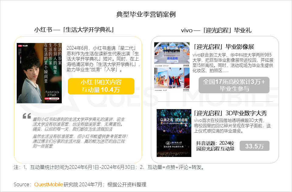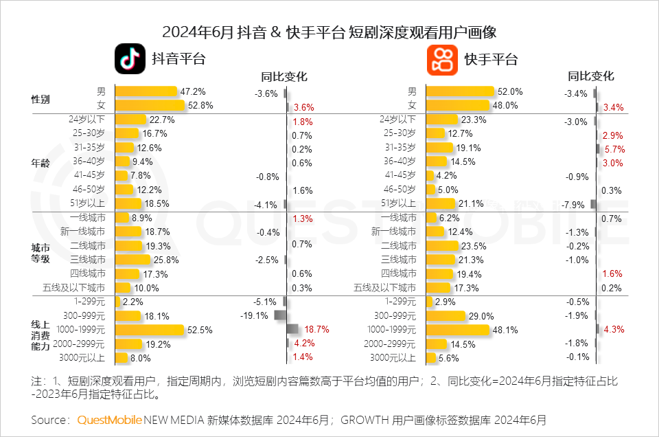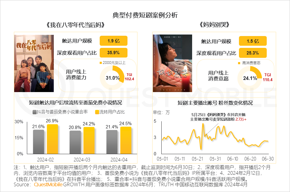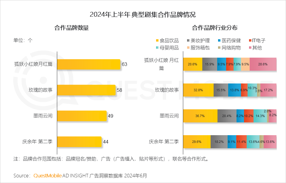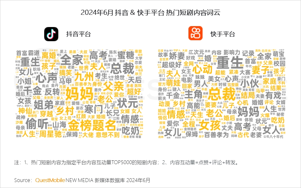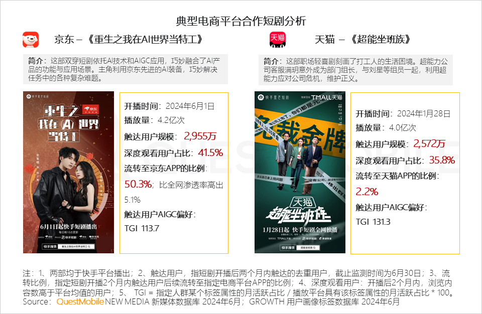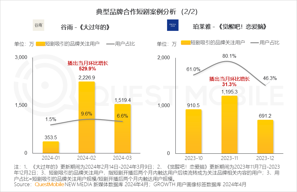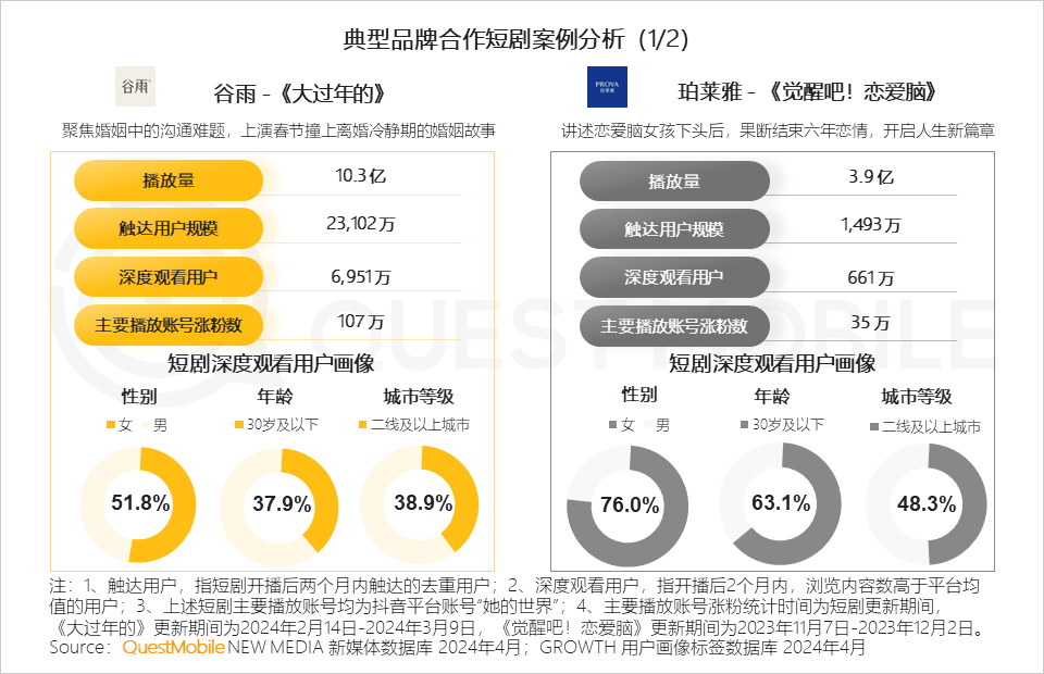 美妆行业中,韩束、珀莱雅等国货品牌在软广投放上排名前列,投放金额均超2,000万,而家用电器中则更为突出,投放费用排名前三品牌均为国货品牌。5.2 热剧营销如火如荼,从内容场到消费场,品牌瞄准优质内容Ⅰ. 2024年上半年,长剧爆款频出,头部作品影响力持续Ⅱ. 各平台独播剧同档竞争,多类型多题材,满足观众内容偏好的同时也带动品牌营销积极性Ⅲ. 热播剧集吸金优势明显,其中快消类品牌合作最为活跃Ⅳ. 短剧行业不仅产业链日益完善,商业模式也日趋成熟,涵盖了广告合作、用户付费模式,并拓展至直播带货等领域Ⅴ. 短剧成为用户重要的娱乐方式之一,短视频平台短剧内容用户渗透率超6成,其中近三成用户为深度观看用户QuestMobile数据显示,抖音与快手平台短剧内容触达用户规模分别达4.74亿、2.59亿,其中深度观看用户分别达13,245.2万和6,928.0万。Ⅵ. 针对短视频平台短剧,女性和中等消费能力群体显著增长,抖音吸引更多24岁以下及高消费群体,快手拓展更多社会中坚力量Ⅶ. 短剧赛道日益内卷,题材焕新速度快,及时监测市场动态并迅速响应观众需求成为短剧创作者与品牌策略制定的重要考量因素短视频平台短剧热门内容元素类似,霸道总裁、重生、亲情、萌娃等元素被高频提及,短剧也是此前网络“爽文”的可视化表现。Ⅷ. 多样化的题材吸引不同观众,品牌通过定制短剧,精准筛选用户如谷雨合作的离婚+亲情题材短剧《大过年的》,播出时间与过年团圆时间契合,吸引了抖音平台超2亿用户观看,受众相对广泛。珀莱雅合作的女性意识觉醒短剧《觉醒吧!恋爱脑》则吸引了更多年轻女性观看。QuestMobile数据显示,《大过年的》开播后两个月触达用户中,2024年2月有2226.9万用户关注谷雨品牌内容,相比开播前一个月环比上涨529.9%;《觉醒吧!恋爱脑》触达用户中,2023年11月有1195.3万用户关注珀莱雅内容,环比上涨31.3%。Ⅹ. 电商平台也瞄准短剧赛道,通过短剧为自身引流,洞察用户偏好,应用最新题材吸引用户眼球QuestMobile数据显示,京东合作短剧《重生之我在AI世界当特工》触达用户中有一半用户后续使用京东APP,比全网使用京东APP的比例高出5.1个百分点,一定程度上体现了短剧对于电商平台的引流作用。Ⅺ. 付费短剧通过情节设置,有效吸引并转化高消费用户;此外,“书改剧”为原著IP平台注入新流量5.3 代言营销激发消费潜力,品牌热度获得短期高曝光Ⅰ. 2024年上半年,美妆、食品等品牌持续通过代言营销抢占消费者心智Ⅱ. 顶流代言人在短期能有效拉高品牌热度,高投入的代言费用撬动成倍的营销效果,同时,代言人与品牌调性的契合度也同样重要5.4 品牌营销踩准当下热点事件,把握社会情绪营销Ⅰ. 热点事件 - 毕业季营销:品牌瞄准未来年轻消费群体,用真诚打造毕业季仪式感,直击年轻人心灵,深化品牌与年轻群体的沟通