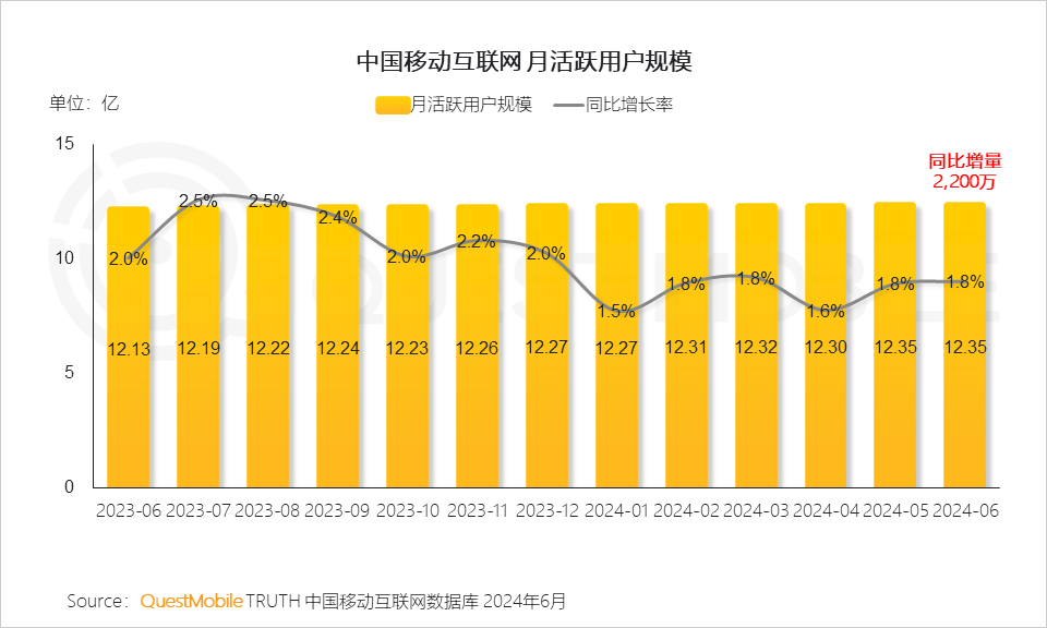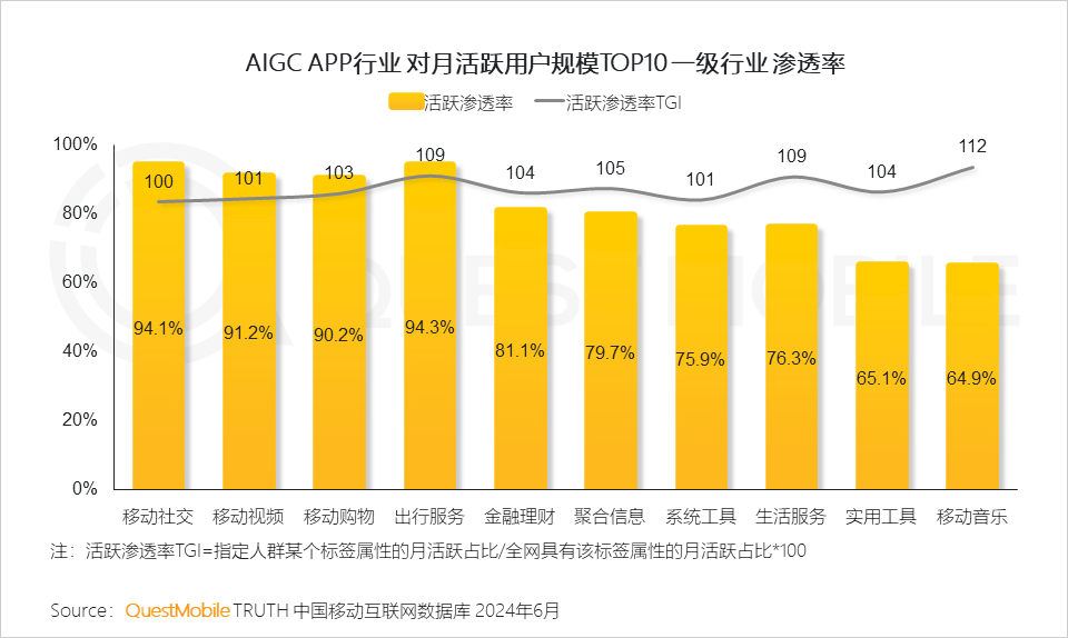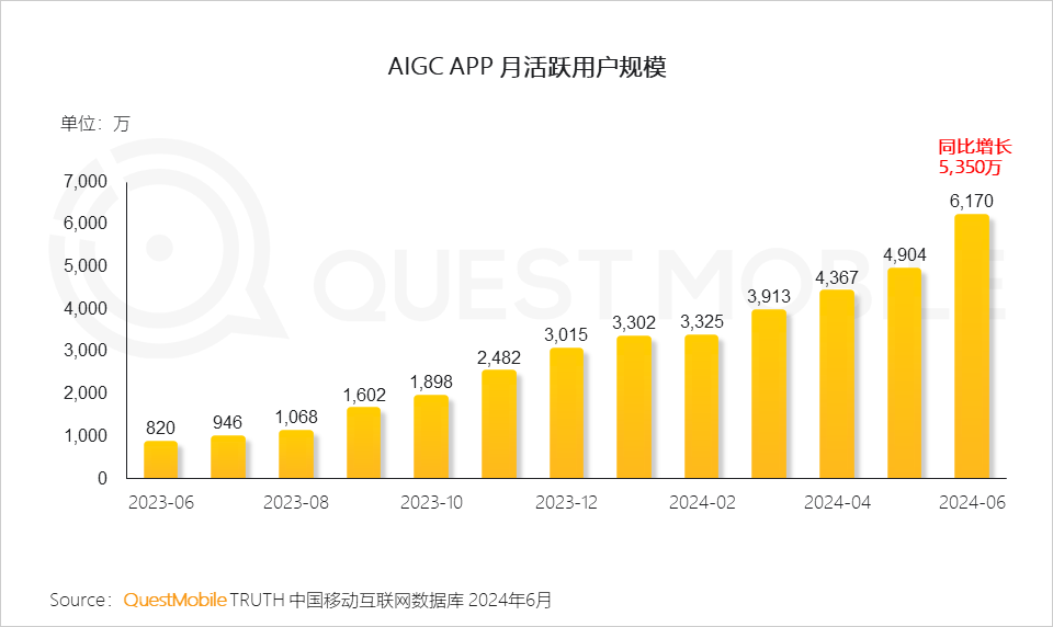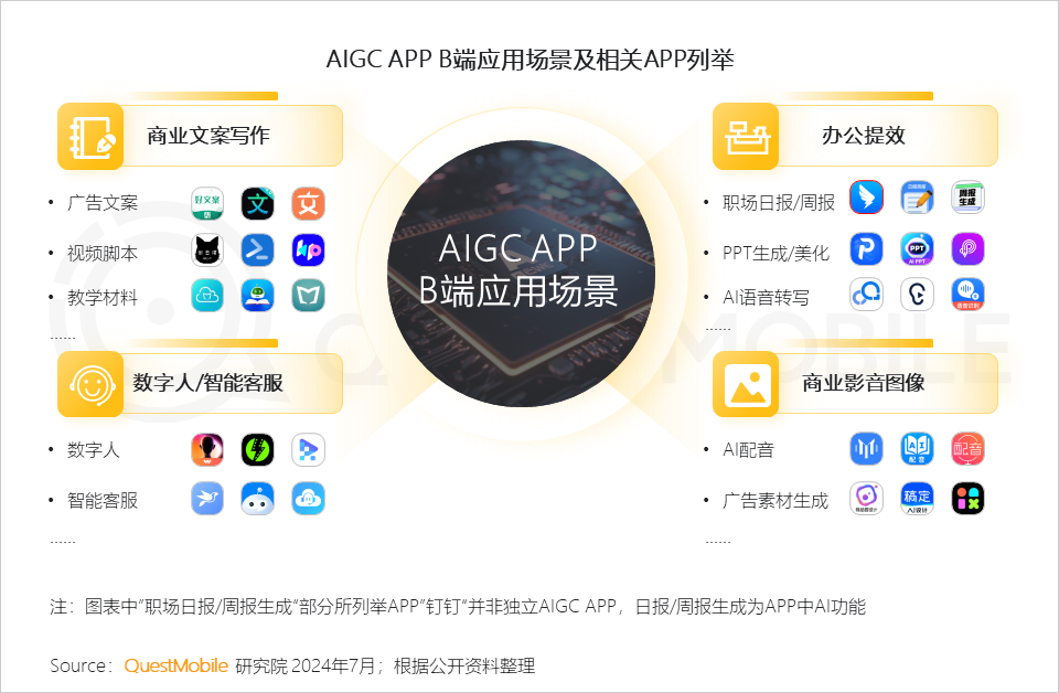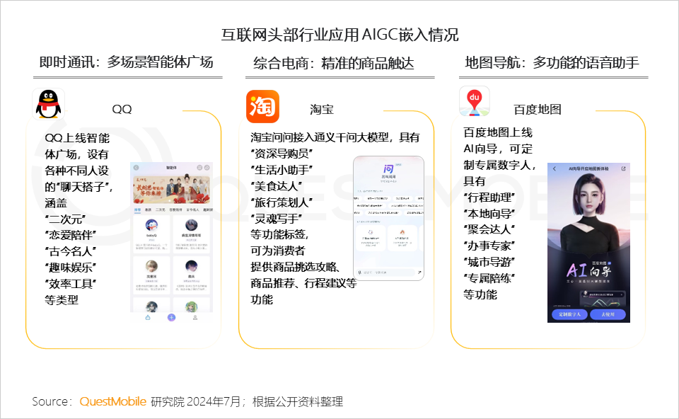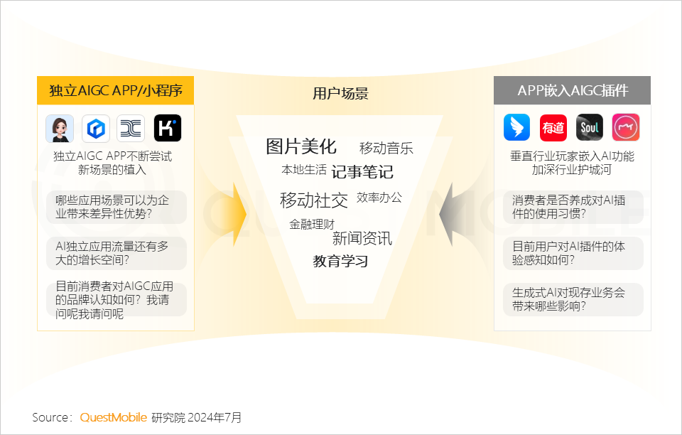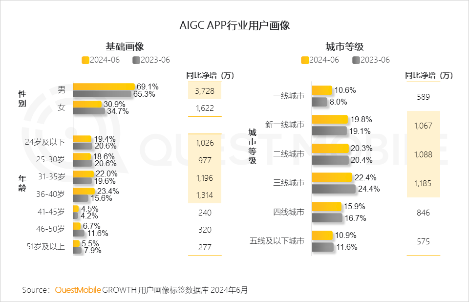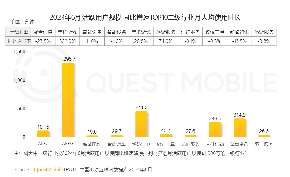 QuestMobile数据显示,截止到2024年6月,移动互联网月活跃用户规模达到12.35亿,同比增长1.8%,不同于此前四五线城市用户支撑起大盘增长,今年上半年新增用户主要来自于一线城市,这也让一线用户的占比增加至9.3%(同比上升了1%),显示出上半年人群向一线城市聚集的态势明显。人群变化,带来了不同领域使用上的变化。线上娱乐、生活消费、教育求职、旅游出行、购物金融和汽车消费,成为“六大亮点领域”。2024年6月,生活服务行业月活用户规模达到8.65亿,月人均使用时长达到222.8分钟,同比分别增长了4.5%、4.8%,显示出城市生活消费复苏态势明显,尤其是本地生活、电影演出,月活规模同比增长了11.1%、22.7%。线上娱乐领域中,短视频月活用户已经达到9.89亿;教育求职领域,教育工具月活用户达到1.33亿,同比增长了14.5%;旅游出行领域总体用户规模已经达到了10.67亿,旅行工具、航班服务、酒店服务、火车服务、用车服务月活用户规模分别增长了35%、29.9%、25.8%、24.8%、16.2%。购物金融、汽车消费领域中,移动购物行业月活规模达10.8亿,同比增长3.5%,银行类APP、车企类APP的崛起,正在改变这两个领域的传统使用模式……除了以上六大领域,过去一年,AIGC APP行业在所有互联网二级行业中脱颖而出,行业规模迎来爆发式增长。QuestMobile数据显示,2024年6月,AIGC类APP的月活跃用户规模达6170万,同比增长653.3%(净增5350万)。同时,过去一年,AIGC新增用户量,主要来自新一线、二线及三线城市用户。40岁以下中青年是核心“尝鲜”人群,占比超过8成。尝鲜用户的不稳定性,也导致AIGC行业人均使用时长同比下滑了23.5%(°_°)…黏性、黏性、黏性,重要的事情说三遍,用起来才是王道!另一个崛起的是面向B端的云服务、大模型服务,除了传统AI PaaS、AI IaaS,AIGC类的APP已经基于场景细分,覆盖了商业文案写作、办公、数字人/智能客服、商业影音图像等等各类B端应用领域,例如,视频脚本的“开拍”、广告素材生成的“美图设计室”、AI配音的“魔音工坊”,月活用户规模分别达到了83.1万、75.3万、50.6万。同时,全网头部APP也已经纷纷布局嵌入式AI,电商领域的智能导购、工具类的智能助理等等,强化现有用户在APP使用中的便捷性、开发出更多人性化功能,增加APP使用黏性,例如淘宝问问接入“通义千问大模型”,具备资深导购、生活助手、美食达人、旅行策划、灵魂写手等等功能,为用户提供商品挑选、推荐、行程建议等等功能。显然,这进一步激化了整个AI应用的竞争烈度……具体怎样不妨看报告吧……