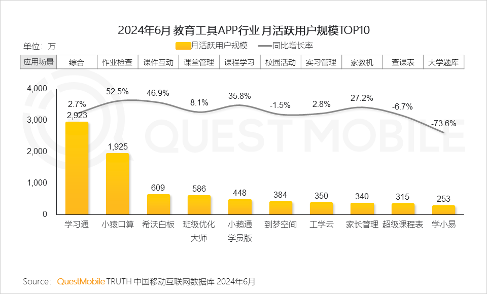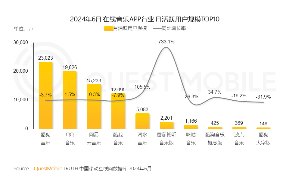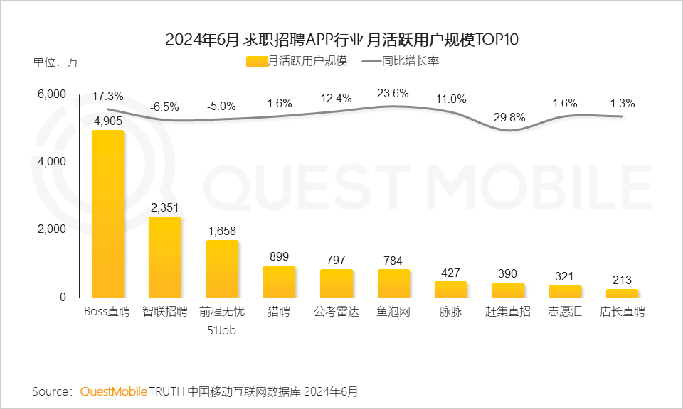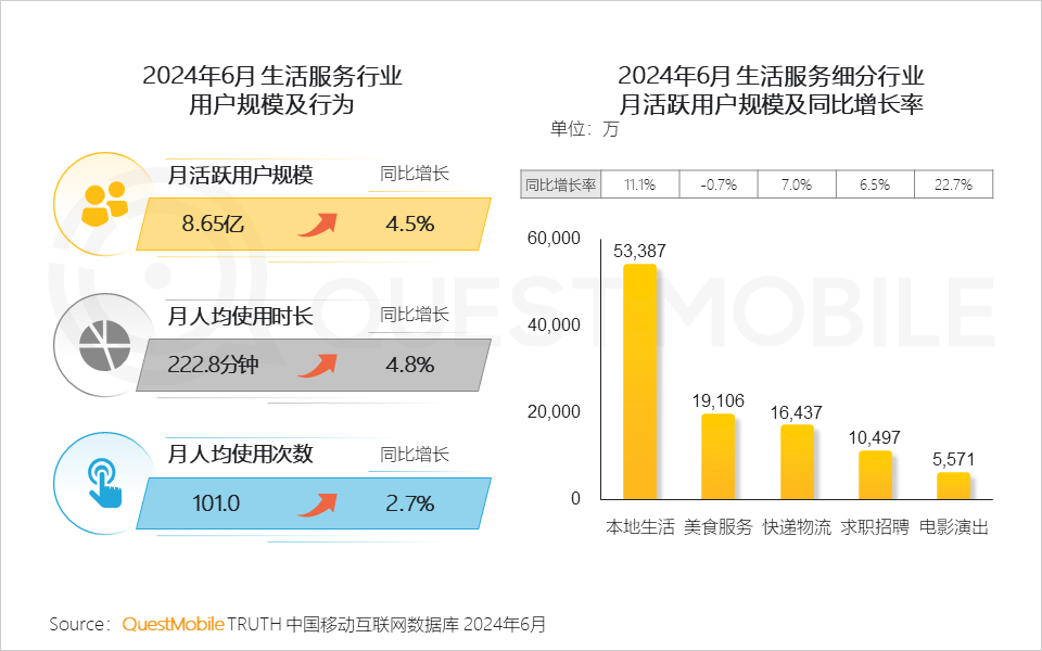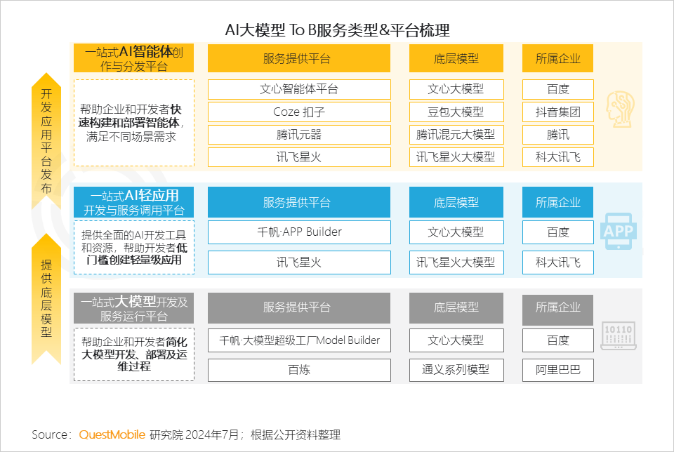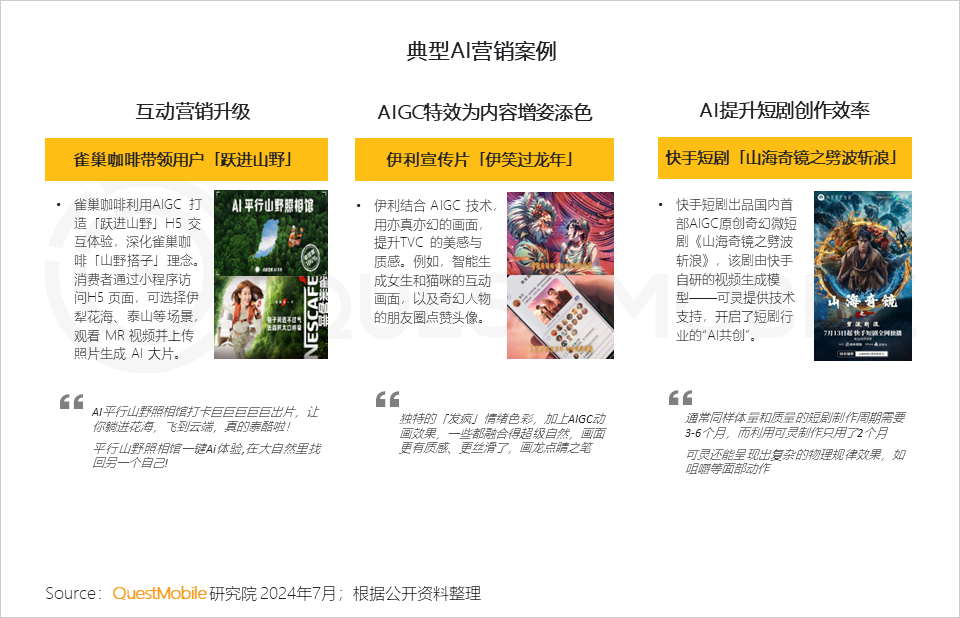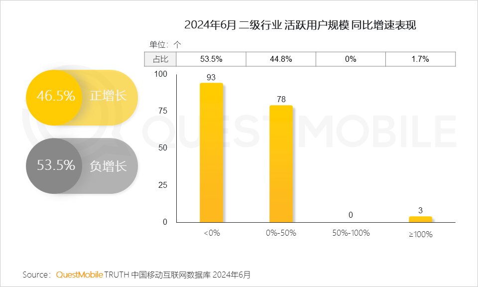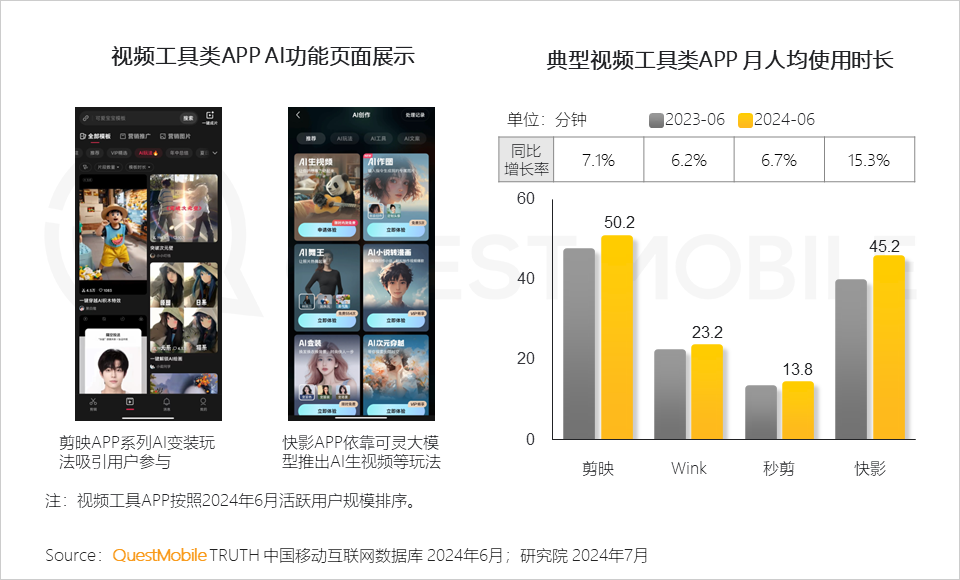 QuestMobile数据显示,截止到2024年6月,移动互联网月活跃用户规模达到12.35亿,同比增长1.8%,不同于此前四五线城市用户支撑起大盘增长,今年上半年新增用户主要来自于一线城市,这也让一线用户的占比增加至9.3%(同比上升了1%),显示出上半年人群向一线城市聚集的态势明显。人群变化,带来了不同领域使用上的变化。线上娱乐、生活消费、教育求职、旅游出行、购物金融和汽车消费,成为“六大亮点领域”。2024年6月,生活服务行业月活用户规模达到8.65亿,月人均使用时长达到222.8分钟,同比分别增长了4.5%、4.8%,显示出城市生活消费复苏态势明显,尤其是本地生活、电影演出,月活规模同比增长了11.1%、22.7%。线上娱乐领域中,短视频月活用户已经达到9.89亿;教育求职领域,教育工具月活用户达到1.33亿,同比增长了14.5%;旅游出行领域总体用户规模已经达到了10.67亿,旅行工具、航班服务、酒店服务、火车服务、用车服务月活用户规模分别增长了35%、29.9%、25.8%、24.8%、16.2%。购物金融、汽车消费领域中,移动购物行业月活规模达10.8亿,同比增长3.5%,银行类APP、车企类APP的崛起,正在改变这两个领域的传统使用模式……除了以上六大领域,过去一年,AIGC APP行业在所有互联网二级行业中脱颖而出,行业规模迎来爆发式增长。QuestMobile数据显示,2024年6月,AIGC类APP的月活跃用户规模达6170万,同比增长653.3%(净增5350万)。同时,过去一年,AIGC新增用户量,主要来自新一线、二线及三线城市用户。40岁以下中青年是核心“尝鲜”人群,占比超过8成。尝鲜用户的不稳定性,也导致AIGC行业人均使用时长同比下滑了23.5%(°_°)…黏性、黏性、黏性,重要的事情说三遍,用起来才是王道!另一个崛起的是面向B端的云服务、大模型服务,除了传统AI PaaS、AI IaaS,AIGC类的APP已经基于场景细分,覆盖了商业文案写作、办公、数字人/智能客服、商业影音图像等等各类B端应用领域,例如,视频脚本的“开拍”、广告素材生成的“美图设计室”、AI配音的“魔音工坊”,月活用户规模分别达到了83.1万、75.3万、50.6万。同时,全网头部APP也已经纷纷布局嵌入式AI,电商领域的智能导购、工具类的智能助理等等,强化现有用户在APP使用中的便捷性、开发出更多人性化功能,增加APP使用黏性,例如淘宝问问接入“通义千问大模型”,具备资深导购、生活助手、美食达人、旅行策划、灵魂写手等等功能,为用户提供商品挑选、推荐、行程建议等等功能。显然,这进一步激化了整个AI应用的竞争烈度……具体怎样不妨看报告吧……