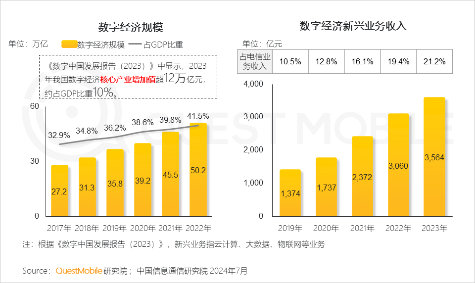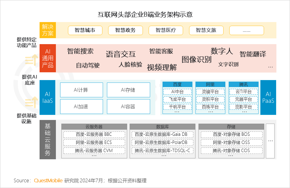 1、政策制度不断完善,基础设施持续建设,我国数字经济规模蓬勃发展,互联网大盘流量同步稳定增长1.1 2024年上半年,围绕数据要素、数字经济、数字社会、智慧城市建设等领域,国家发布多项政策,推动数字经济高质量发展并取得显著成效长国家统计局数据显示:1-5月,规模以上信息传输、软件和信息技术服务业企业营业收入增长11.2%;上半年,实物商品网上零售额同比增长8.8%,占社会消费品零售总额25.3%。1.2 云计算、大数据、物联网等数字经济新兴业务收入连年攀升,2023年占电信业务收入占比超20%1.3 数字经济底层基础设施建设步伐加快,网络基础建设,算力基础建设不断扩容提速,为数字经济发展提供有力支持1.4 互联网大盘流量保持在稳步提升的态势,全年增速保持在2.0%左右1.5 现阶段,互联网用户增量主要来源为一线城市人群,用户向高线级的城市聚集1.6 全网的触网程度有所起伏,月人均使用时长有所增长,人均使用次数则出现小幅下降,用户对APP使用集中度提高1.7 全网月人均使用APP个数基本持平,月人均使用21-40个APP用户占比有所提升QuestMobile数据显示,可能受到近一年持续上新大量AIGC APP影响,月人均使用21-40个APP的用户占比高于去年同期,2024年6月,使用 21-30个APP的用户占31.1%,使用31-40个APP的用户占21.4%。2.1 AIGC 行业迅速增长,成为互联网大盘增长不可忽视的一环Ⅰ. QuestMobile数据显示,93个互联网二级行业出现一定程度的流量下降,正增长的二级行业占46.5%,其中增速高于100%的有3个,高速增长的行业成为大盘新鲜血液注入剂Ⅱ. 过去一年,AIGC APP行业在所有互联网二级行业中脱颖而出,行业规模迎来爆发式增长QuestMobile数据显示,2024年6月,AIGC APP行业 月活跃用户规模达6,170万,同比增长653.3%。Ⅲ. AIGC APP行业增量主要来自男性、40岁以下中青年、新一线城市、二线城市以及三线城市用户Ⅳ. AIGC APP行业虽然规模激增,但可能存在部分未深度使用的“尝鲜型”用户,导致行业人均使用时长较去年有一定减少2.2 企业服务、电子商务等传统的B端领域之上,正日益受到关注的是云服务和大型模型服务等新兴业务。Ⅰ. 互联网头部企业B端业务以基础云计算为底层基础设施,依托AI PaaS、AI IaaS两个AI大底座以及AI通用产品,聚焦不同行业核心场景,为B端客户输送各种解决方案Ⅱ. 【B端流量】AI大模型服务主要包含大模型开发平台、AI轻应用开发平台以及智能体创作分发平台、三者逐层递进,共同扩展互联网B端流量边界Ⅲ. AIGC APP覆盖各类B端场景、涉及商业文案写作、办公、数字人/智能客服、商业影音图像等3、AIGC APP以场景抢用户:AIGC APP行业月活跃用户破六千万,并逐渐对其他行业形成冲击3.1 2024年成为AI相关应用的发展元年,AIGC APP行业规模增长迅速,6月行业规模超6,000万3.2 从现有应用场景来看,大致可分为AI工具和AI社交/娱乐两大赛道;既有场景聚焦型APP,也有多场景覆盖的综合型APP3.3 伴随AIGC APP行业进一步发展,其对互联网头部行业渗透明显,逐渐开始对各行业形成冲击3.4 全网头部APP在AI领域持续布局,绝大多数已嵌入AI功能,涵盖智能导购、智能助理、智能搜索、智能向导等多方面功能3.5 互联网头部行业AI化的趋势明显加强,头部行业应用依托自身高流量基础,用户长期使用习惯,以及平台对用户的深刻理解进一步利用AI强化APP自身属性