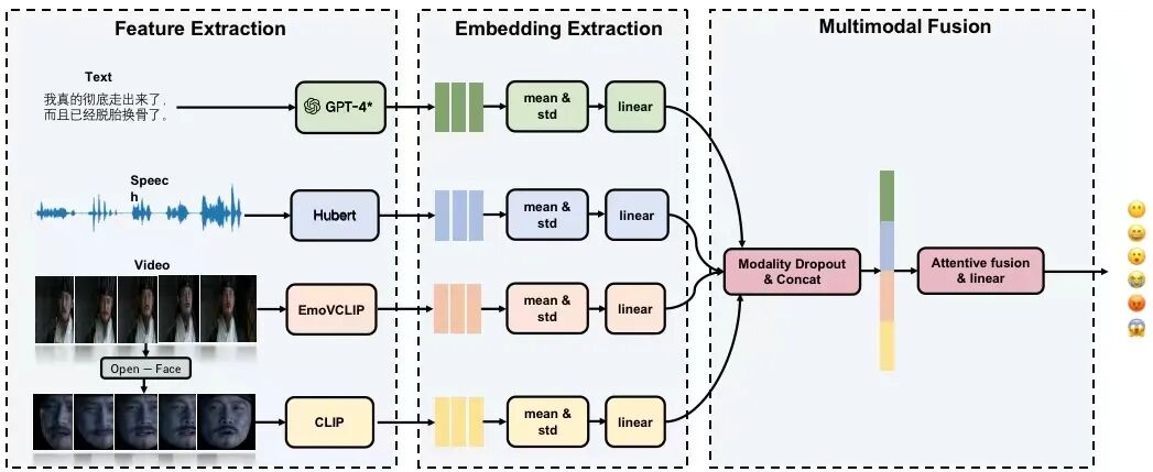 针对赛道少标签数据、高技术要求的特征,Soul 团队基于此前积累的自研大模型部分模块做好了充足的赛前准备,并确定了一套可行性创新技术方案。在整体思路上采取「先主干后微调」的策略,首先集中精力提高每一个核心特征提取模型的泛化性,然后再融合在一起;在具体实现过程中又做了以下几个方面工作。这些构成了他们的核心优势。首先前期关注多模态特征提取。在端到端模型架构中,利用预训练模型提取文本、语音和视觉不同模态的情感表征,关注情感中的共性和差异性,从而来提升情感识别效果。后期根据多种模态的各模态特征提出有效的融合方法,将这些模块融合形成模型架构。为了提高预训练模型的泛化性能,Soul 团队专门针对视频模态在情感识别领域首次提出了 EmoVCLIP,EmoVCLIP 是一个基于大模型 CLIP 结合 prompt learning 技术在视频情感识别领域更具泛化性能的模型。另外,为了提高文本模态情感识别能力,Soul 团队针对文本模态使用 GPT-4 来打情感伪标签,充分利用 GPT-4 的情感关注能力,提高文本模态在情感识别的准确率,为后面进一步模态融合打下了更好的基础。其次,在多模态特征融合上,Soul 团队首次在多模态情感识别方向使用了 Modality Dropout 策略并研究了不同 dropout rate 的性能影响,为了缓解模态之间的竞争问题,在模型训练过程中随机抑制某个的模态(文本、语音或视频模态)以实现更好的鲁棒性,提升模型在提供的有标签数据之外未见过数据上的泛化能力。最后,半监督学习技术开始发挥作用,其基本思路是使用有标签数据训练出一个模型,然后对无标签数据进行预测,根据预测结果为无标签数据生成伪标签。这些伪标签又用来训练模型,持续提升模型效果。Soul 团队利用半监督学习中这种自训练(Self-training)的策略,循环地为 Semi 赛道超 11 万条无标签数据打伪标签并加入训练集,进行模型迭代更新,得到最终的模型。