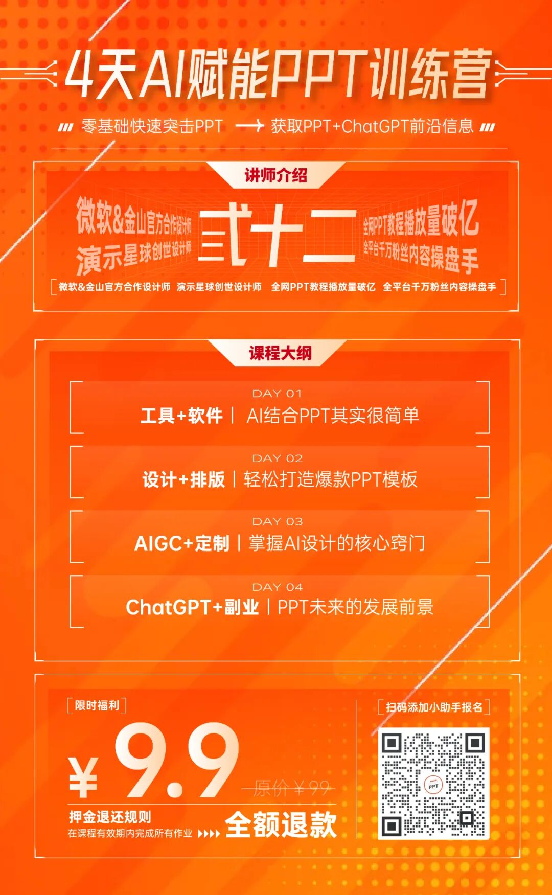 以往你已经错过了房地产、淘宝电商、短视频的风口这次,你还要错过这个「AI躺赢风口」吗?!如果你也想通过AI,做出高大上的设计作品,也想开启小事业,在家做点小生意。珞珈Ai办公研习社推出【4天AI赋能PPT副业营】就不能错过啦~与其说被会用Ai的人取代,不如做最早一批驾驭Ai的人但新事物就意味着新机会,我们普通人要做的就是抢先进场,先学会技能,这样当真正的机会来了,你才能抓得住。俗话说师傅领进门,修行靠个人。但牛逼的老师很大程度上可以帮你节省很多力气。所以这次的课程开发老师我们请来了行业知名的弎十二老师!设计师弎十二账号主理人,5年PPT设计经验,微软&金山官方合作设计师,演示星球创世设计师。500强御用PPT设计师,PPT模板作品的人气超10w;