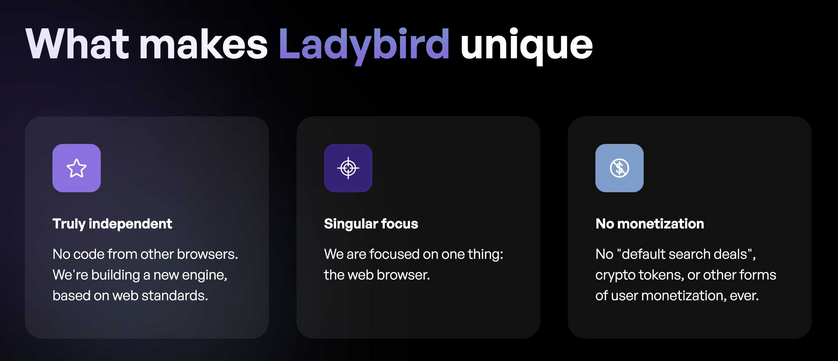 同时,正如文章伊始所述,Ladybird 在开发运营时主打了三个独一无二的特性,即:
