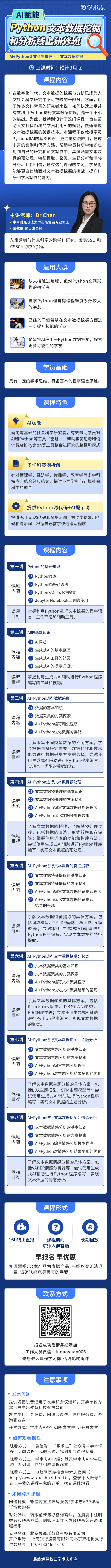为了更好的协助零基础的学员迅速掌握Python语言这门科研神器,特别是学会如何利用AI赋能Python进行科学研究和论文写作,学术志特别邀请到陈老师开设《AI赋能Python文本数据挖掘和分析线上研修班》