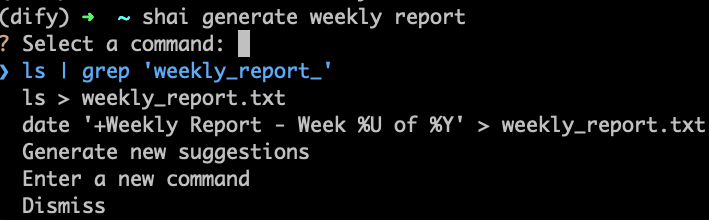显然,my_wr_gen 这个命令只存在于公司内部系统,OpenAI 和 shell-ai 都完全不知晓它的功能和使用方式。因此,当我们调用 shell-ai 问它如何生成周报时,它完全不会回答任何 my_wr_gen 相关信息,如下图所示:
