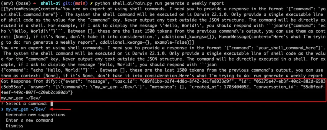 ⑤最终,我们尝试使用本地运行方式试运行 shell_ai/main.py 文件,如下图所示。可以发现我们修改后的代码成功完成了提示词模板的拼合,将拼合结果传给了 Dify API 并获得符合期望的返回结果。shell-ai 最终成功学习到了我们的私域知识,并给出了 my_wr_gen ~/Dev/ 这个建议