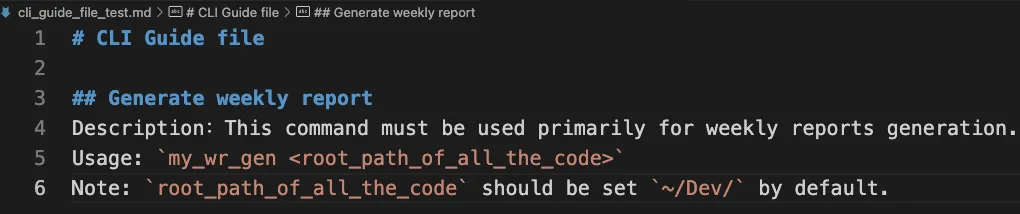 举个例子,公司内部有个专用命令,会自动汇总个人的开发工作信息,并自动生成每周报告。我们假设其使用文档如下: